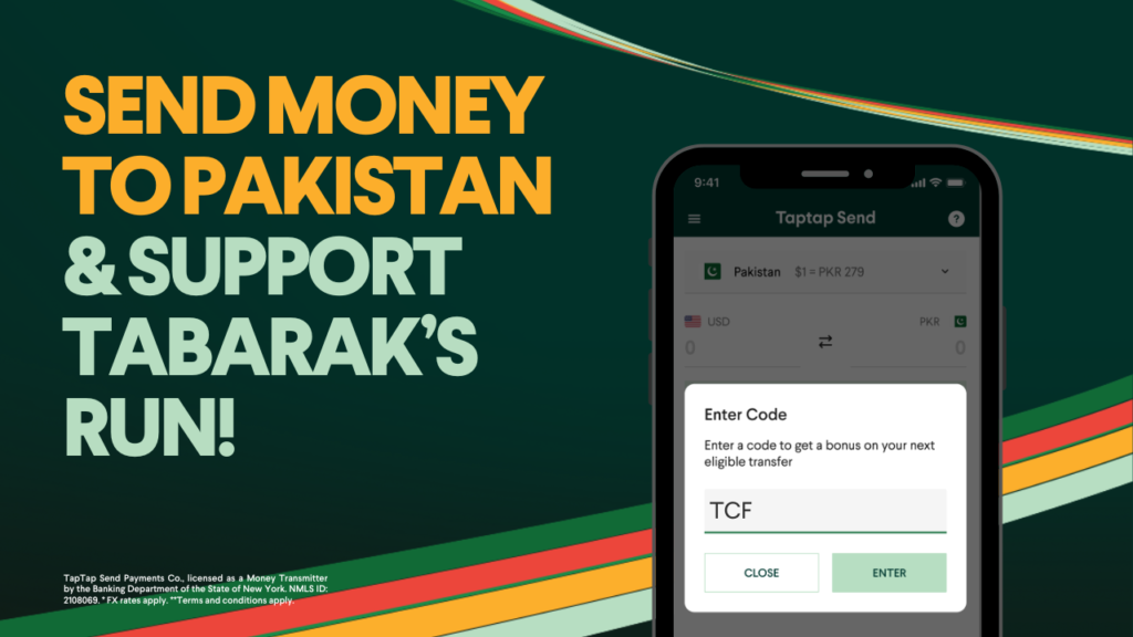 Help support Tabarak’s run for education by sending money to Pakistan through Taptap Send – our official sponsors!